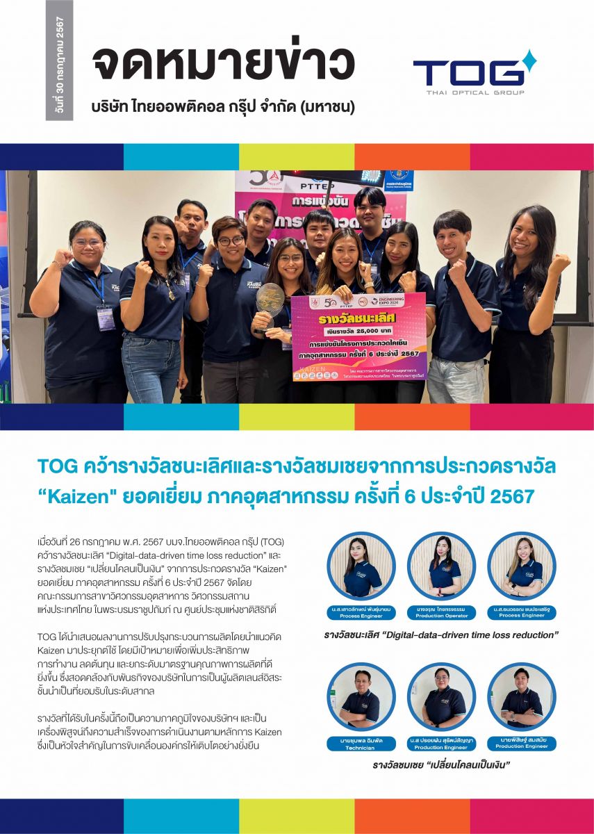 TOG คว้ารางวัลชนะเลิศและรางวัลชมเชย จากการประกวดรางวัล Kaizen ยอดเยี่ยม ภาคอุตสาหกรรม ครั้งที่ 6 ประจำปี 2567